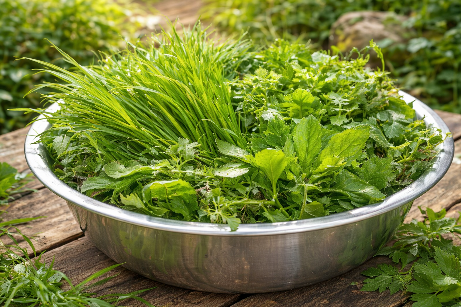 Pertama, kumpulkan rumput dan daun yang memenuhi kriteria. Pastikan semuanya segar.