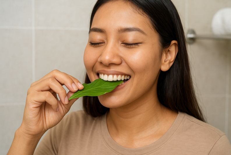 - Gosokkan daun secara perlahan ke permukaan gigi dan area dekat gusi.