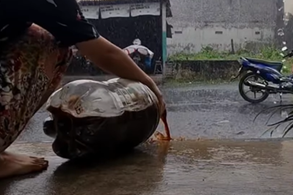 Tren warganet menyiram eco enzyme di jalan saat hujan.(Instagram @matgrosemary)