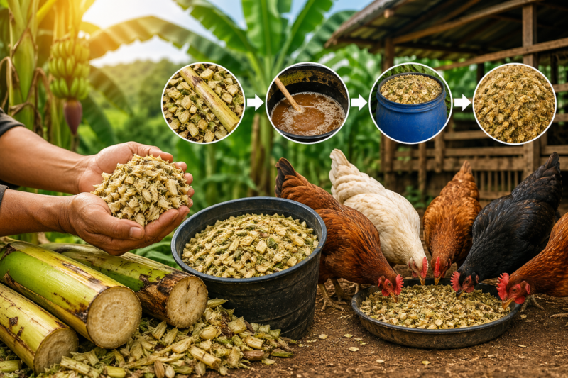 Gedebok pisang yang sering dianggap limbah ternyata memiliki nilai ekonomi tinggi jika peternak mengolahnya dengan benar. Melalui proses fermentasi sederhana, batang pisang bisa berubah menjadi pakan ayam yang hemat, bergizi, dan bermanfaat besar.