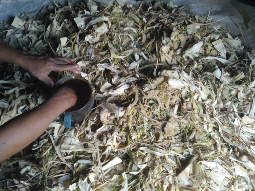 Selanjutnya, siram larutan EM4 sedikit demi sedikit sambil terus mengaduk agar semua bagian terkena larutan secara merata.