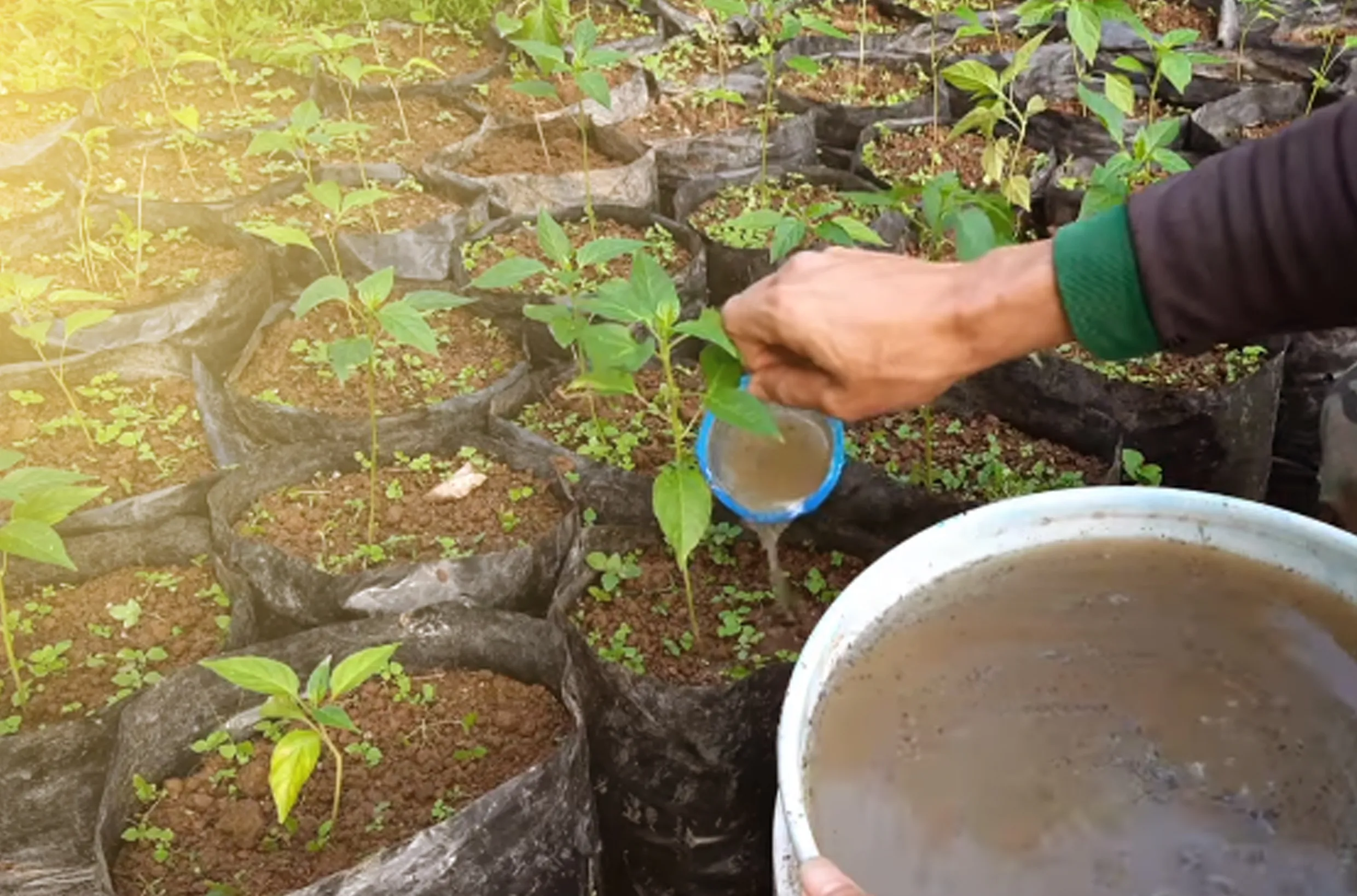 Petani mencampurkan 10–20 ml MOL ke dalam 1 liter air, lalu menyiramkannya ke area perakaran tanaman setiap 1–2 minggu sekali.