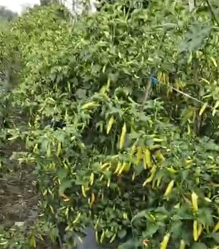Sutino menanam cabe rawit di lahan seluas 0,5 hektar dengan sistem tumpang sari cabe dan timun. Disebutnya, timun habis, cabe mulai berbunga. Timun digantinya dengan kacang panjang.