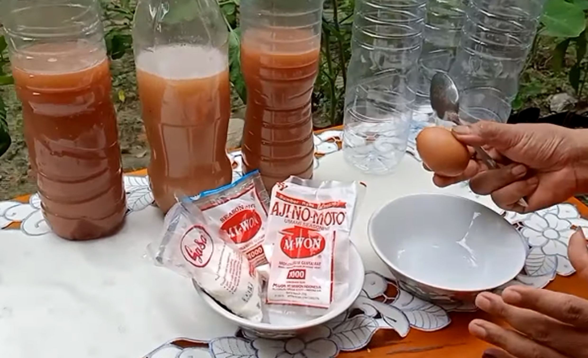 1. Tuang campuran ke botol plastik bekas air mineral 1,5 liter.