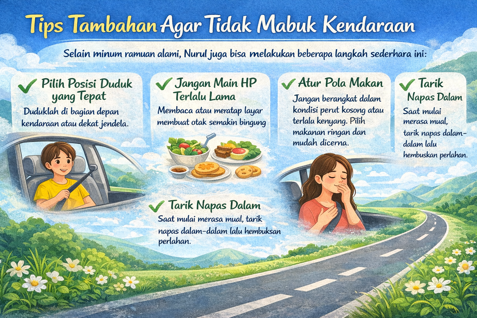 Perjalanan jauh seharusnya menyenangkan, bukan penuh drama mual dan pusing. Dengan persiapan sederhana dan bahan alami yang mudah ditemukan, Nurul bisa menikmati perjalanan dengan lebih nyaman. (rull)