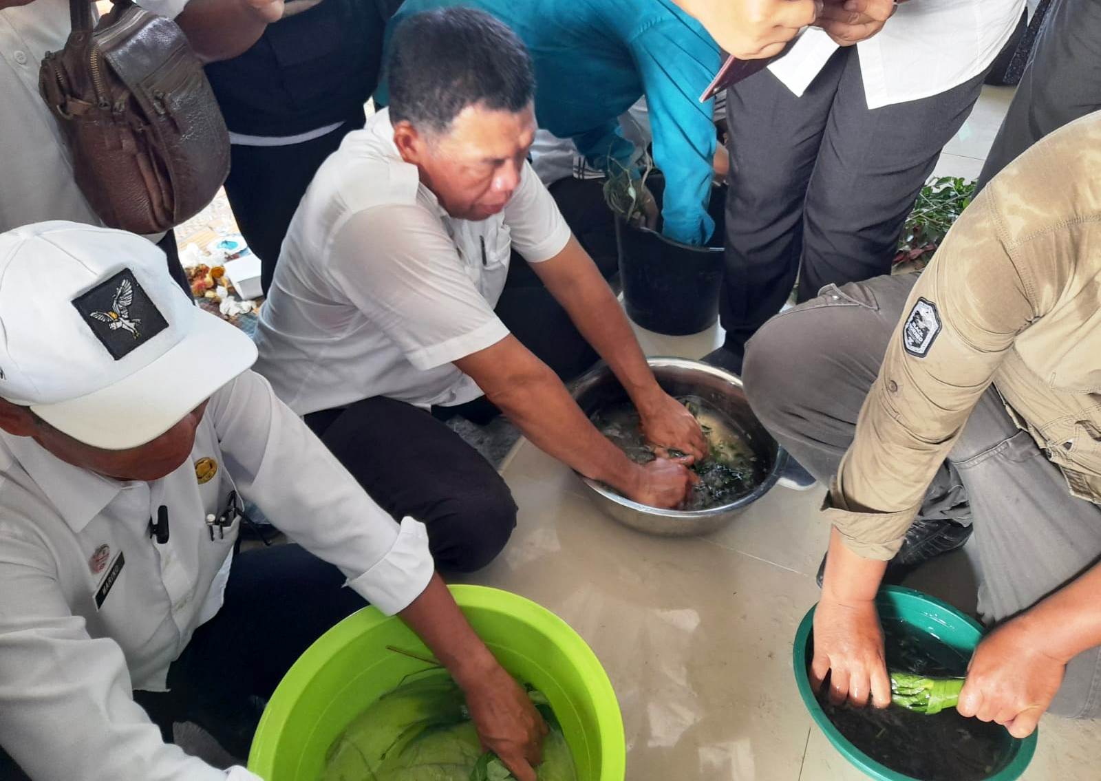 Pertama, petani mengumpulkan berbagai jenis daun dan rumput. Setelah itu, mereka meremas bahan tersebut hingga mengeluarkan sari.